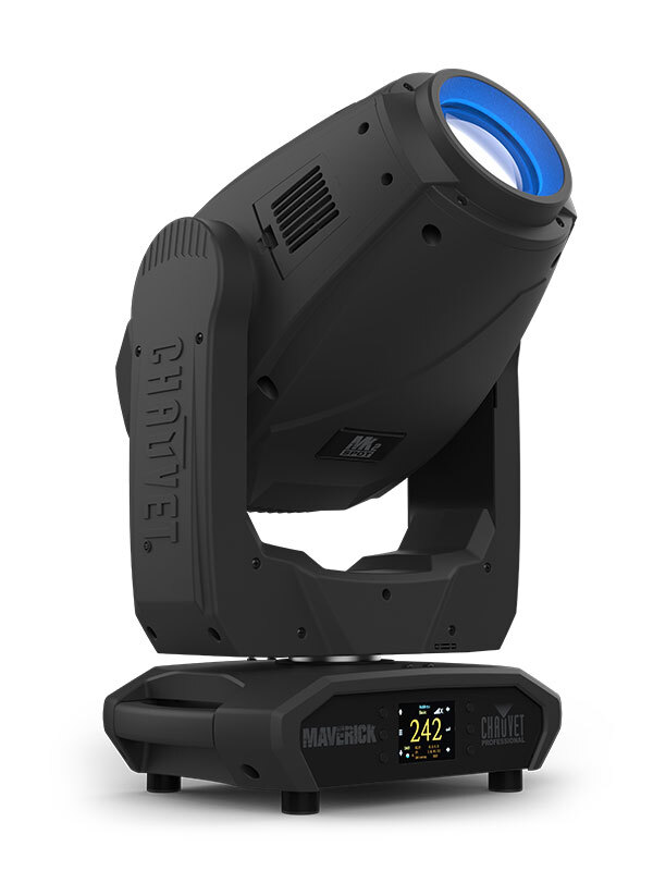 The Chauvet Maverick MK2 Profile moving-head fixture uses a 440 W cool-white LED engine and offers a 13° to 38° zoom range, a CRI of over 90, and a colour temperature of approximately 6 000 K. It incorporates CMY + CTO colour mixing, a 7-position colour wheel plus white, two rotating gobo wheels with interchangeable slot-and-lock gobos, a motorised iris, motorised frost, and a motorised 3-facet rotating prism. The framing system offers a four-blade dual-axis shutter mechanism for beam shaping.